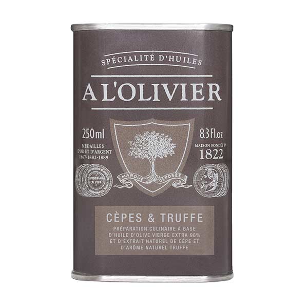 Huile d’olive vierge extra, extrait naturel de cèpe et extrait naturel de truffe Tuber Melanosporum et arôme naturel de truffe.